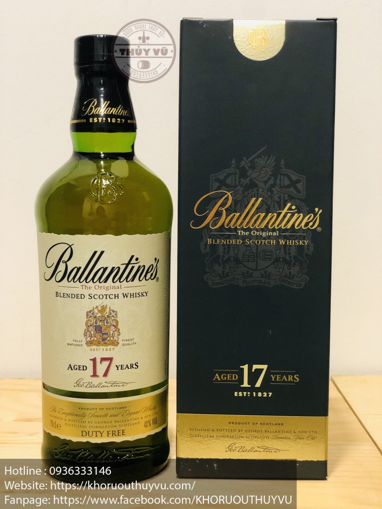 - Rượu Ballantine’s 17 năm là loại rượu ngọt ngào , đầy hương trái cây và gia vị nhẹ nhàng.Rượu Ballantine’s 17 năm là một đồ uống ấn tượng dành để chia sẻ vởi những người bạn , đây còn là loại whisky đầu tiên trên thế giới đạt được hầu hết giải thưởng của rượu whisky 17 năm tuổi 17 YO Blended Scotch.