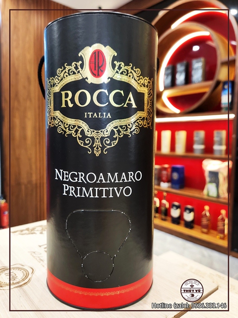 Rocca Negroamaro Primitivo có thiết kế hình ống trụ vô cùng đẹp mắt, lịch thiệp và quý phái. Sự phối màu tinh tế giữa đỏ – đen bóng – chữ trắng và màu vàng của logo. Có quai xách trên ống. Trông ống vang toát lên vẻ cổ điển sang trọng hoàng gia.
