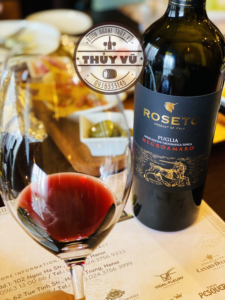 Rượu vang Roseto Negroamaro Puglia có màu đỏ ruby đậm với ánh đen hắt trên thành ly. Rượu vang có hương thơm đậm đà, phức hợp từ các loại quả mọng đen và quả dâu tây, cam thảo, hạt tiêu và lá bách xù. Khi nhấp vào miệng sẽ cảm nhận được sự sảng khoái, hào phóng của cấu trúc rượu cân đối, mạnh mẽ, sánh đặc với lớp tannin mềm mượt, hài hoà. Sau khi đi qua cuống họng rượu vang để lại một hậu vị đậm vị trái cây kéo dài rất lâu.
