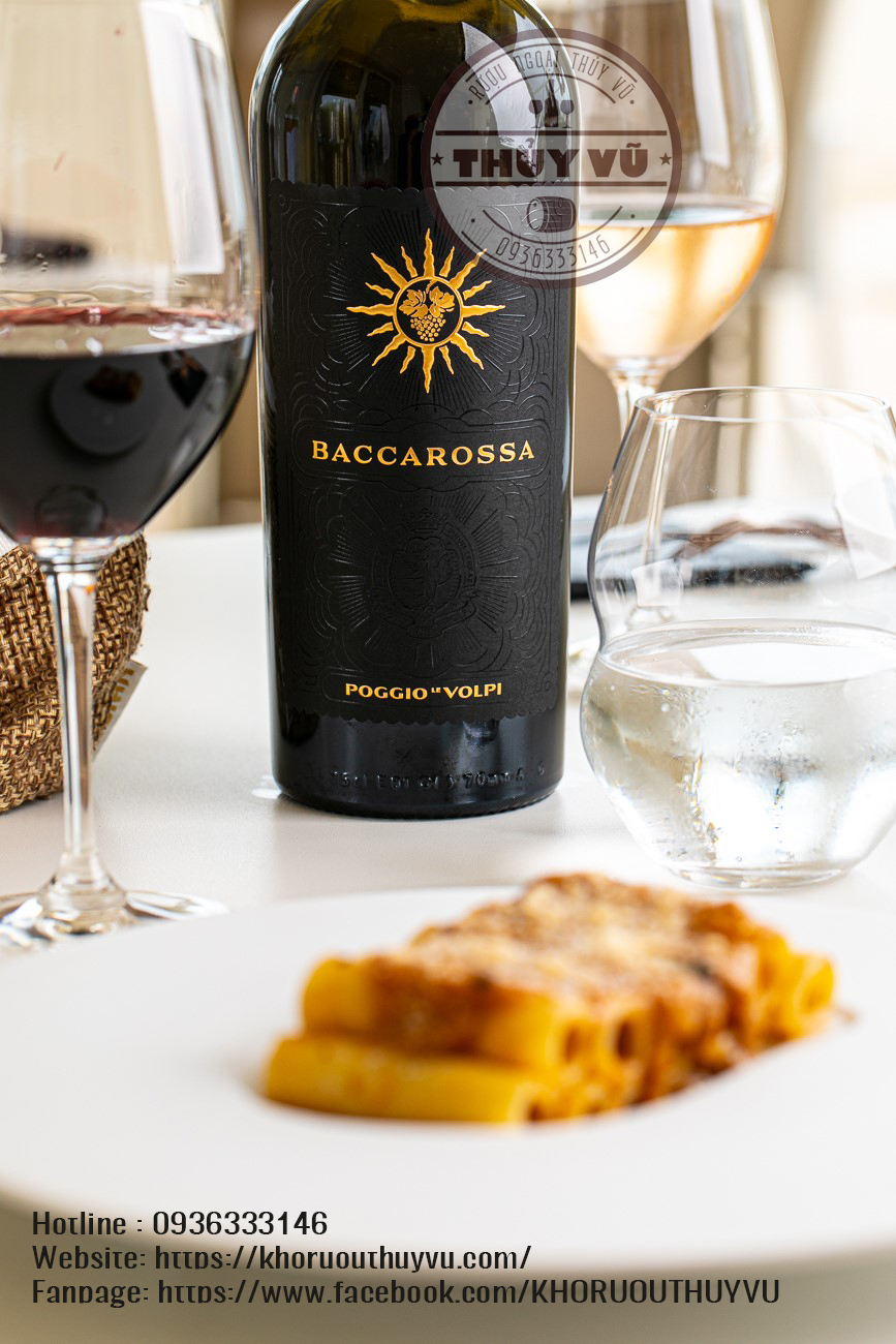 Rượu vang ý Baccarossa có màu đỏ đậm mạnh mẽ quyến rũ. Hương vị mạnh mẽ phức hợp của hoa quả hương mận đen, quả chín đỏ gia vị, đinh hương hoà quyện cùng hương thơm của gỗ Địa Trung Hải, than chì, mùi của khoáng chất, cacao và caramen. Chất r.ượu sánh mịn, thanh lịch cùng tannin chín, bền, cân bằng tốt tạo sự đầy đặn, đậm đà manng lại dư vị nhẹ nhàng, sâu lắng.