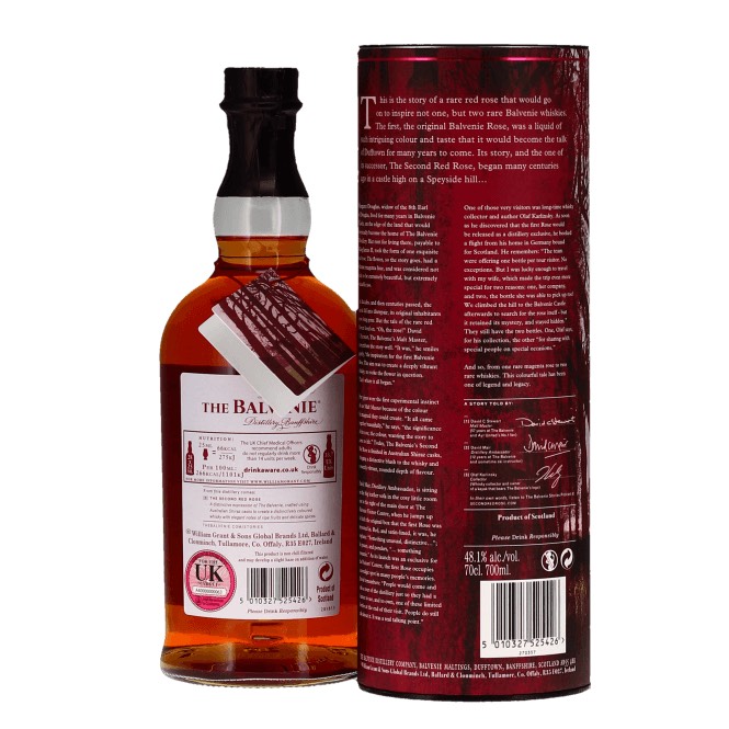 The Balvenie Second Red Rose được hoàn thành trong thùng Shiraz của Úc. Rượu mang đến một sắc đỏ đặc trưng cho rượu whisky. Rượu mang đến hương vị thanh lịch với hương trái cây chín, tươi và gia vị tinh tế.