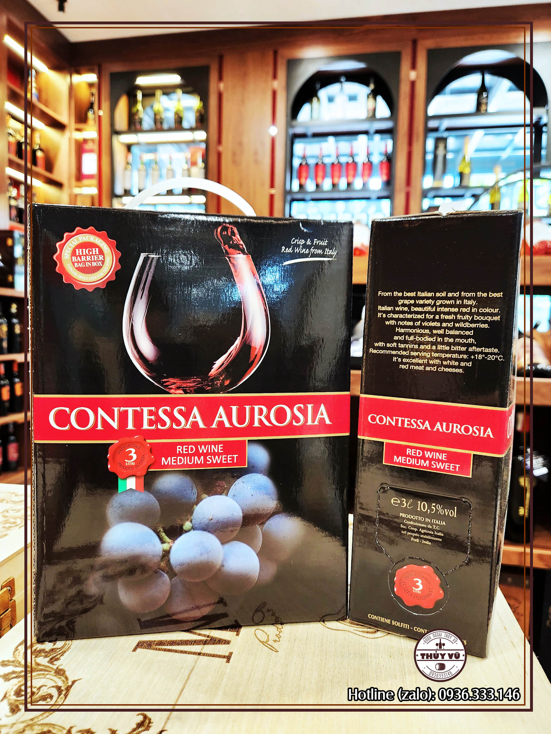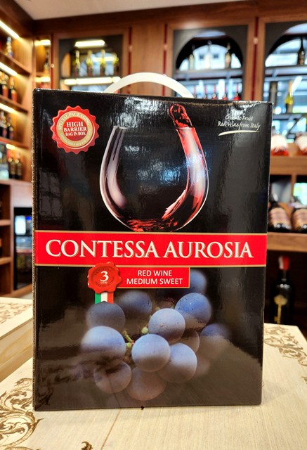 Contessa Aurosia là một bịch rượu vang ngọt có dung tích 3 lít được pha trộn từ nhiều giống nho đỏ địa phương thơm ngon của Ý. Chai vang thuộc kiểu Medium Sweet tức ngọt vừa phải, có thể dễ dàng uống tráng miệng vào cuối bữa ăn nhưng cũng hoàn toàn có thể kết hợp cùng các món ăn trong bữa ăn bình thường.